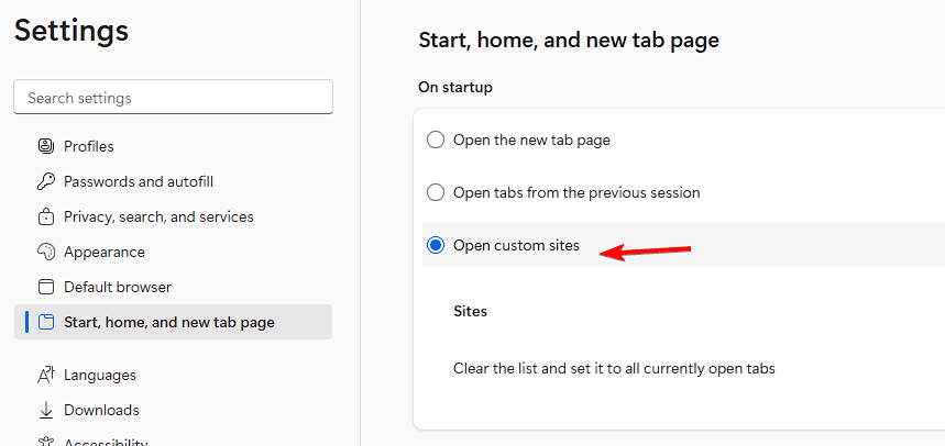 - Under When Edge starts, select Open custom sites.