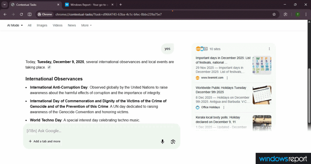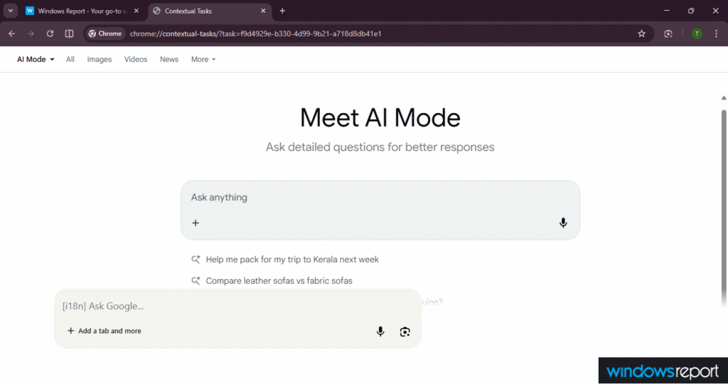The same interface also appears when clicking the “AI Mode” button in the search box on the New Tab Page. Instead of opening Google Search, Chrome now sends that request to the Contextual Tasks page.