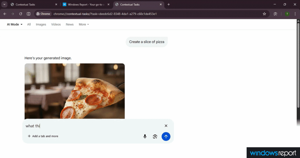 The interface can also create images. We selected “Create images” and asked for a slice of pizza. Chrome generated the image instantly. After that, we typed “what this pizza ingredients.” The tool examined the generated image and listed the common ingredients of pepperoni pizza.