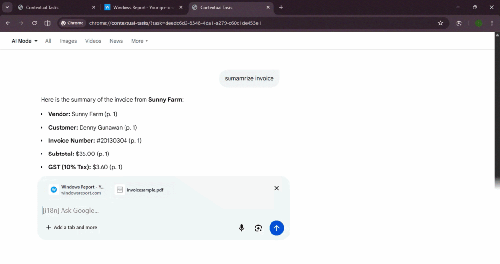 In the same session, we added a PDF invoice through the + menu and asked “summarize invoice.” Chrome ignored the website tab and focused on the PDF. It extracted the vendor name, customer name, invoice number, subtotal, and tax. This confirms the tool can work with different types of context and choose the correct one for the task.