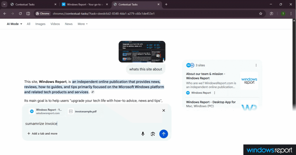 We selected the Windows Report homepage tab and asked “what is this site about.” Chrome returned a clear summary of the website. This shows it can read the page directly without loading another webpage.