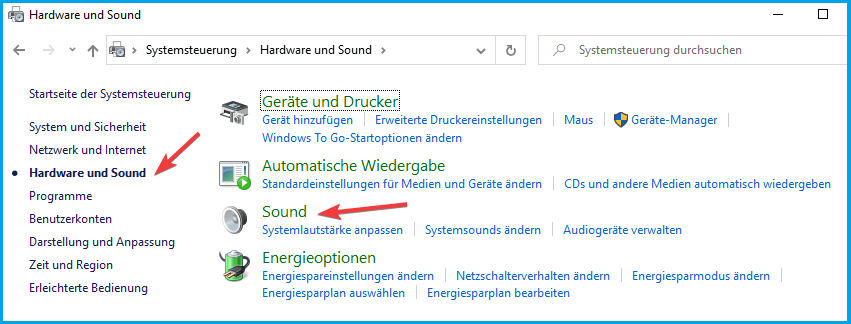 - Unter Hardware und Sound wählen Sie Sound aus.