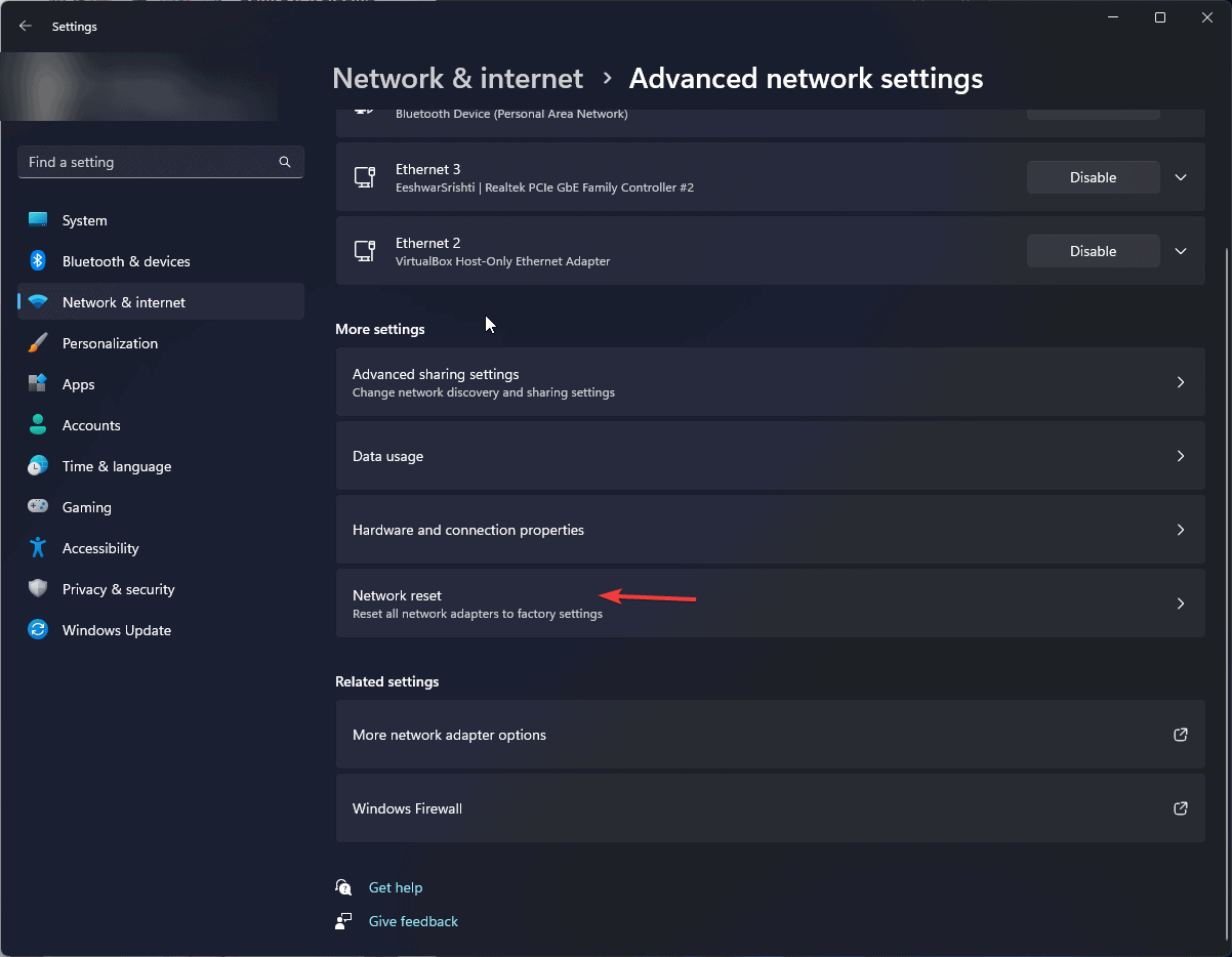 - Click Network reset at the bottom.