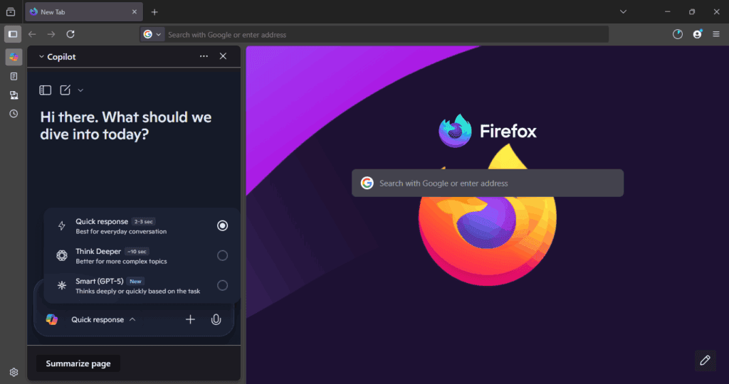 Copilot arrives in Firefox Nightly with Quick Response, Think Deeper, and Smart GPT-5 modes,