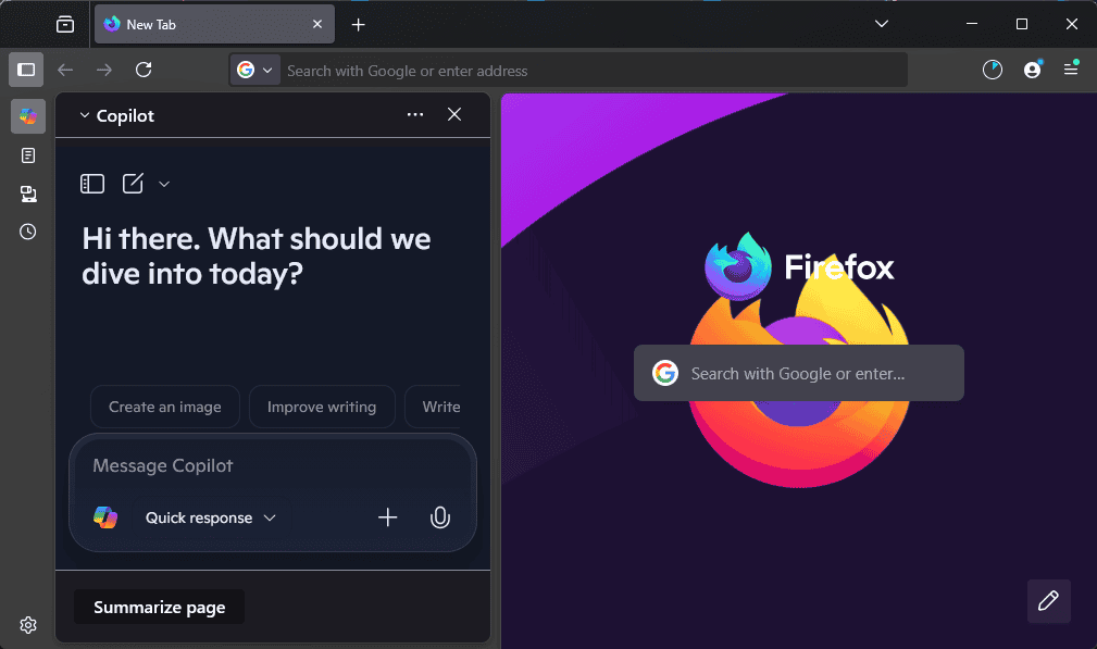 These options mirror what Copilot offers in Edge, though in Firefox, they remain limited to the sidebar interface.