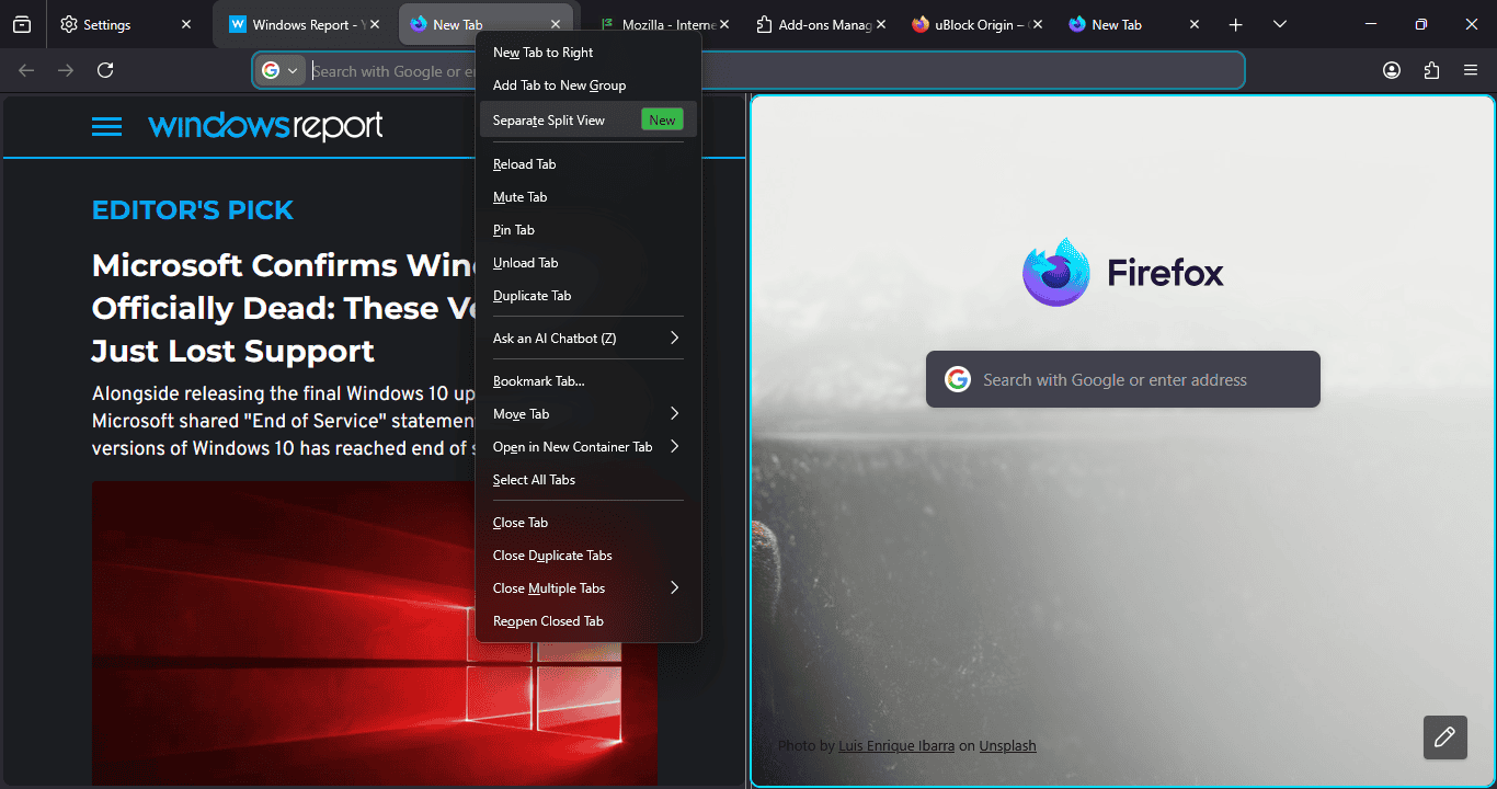 Like the built-in VPN Firefox is currently testing, Split View could soon become another standard feature across browsers. The Split View option now appears in the tab context menu, but Mozilla may also add a toolbar button, keyboard shortcuts, or in-view controls to make it easier to find and use.