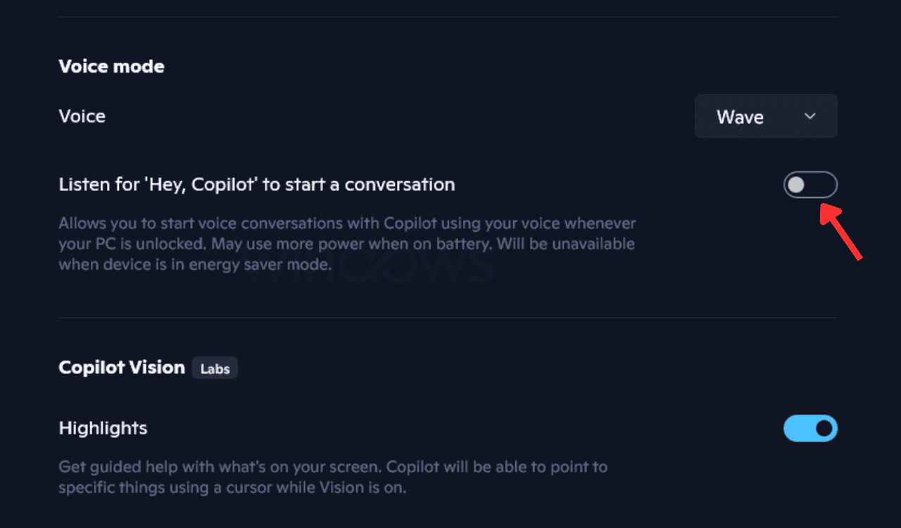 - Toggle off “Listen for ‘Hey Copilot’ to start a conversation.”