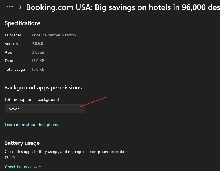 - Go to Background app permissions, tap the drop-down button, and click Never.