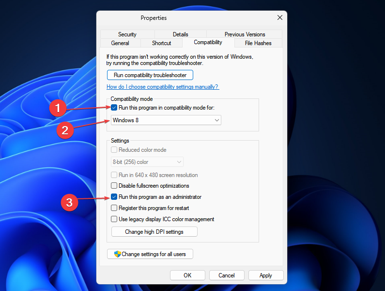- Check the box for Run this program in compatibility mode and choose a Windows version from the drop-down.