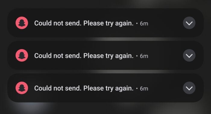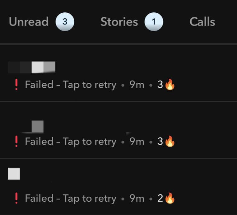 - Snaps failing to send or getting stuck on “Sending…” or “Failed – Tap to retry error” as seen above.