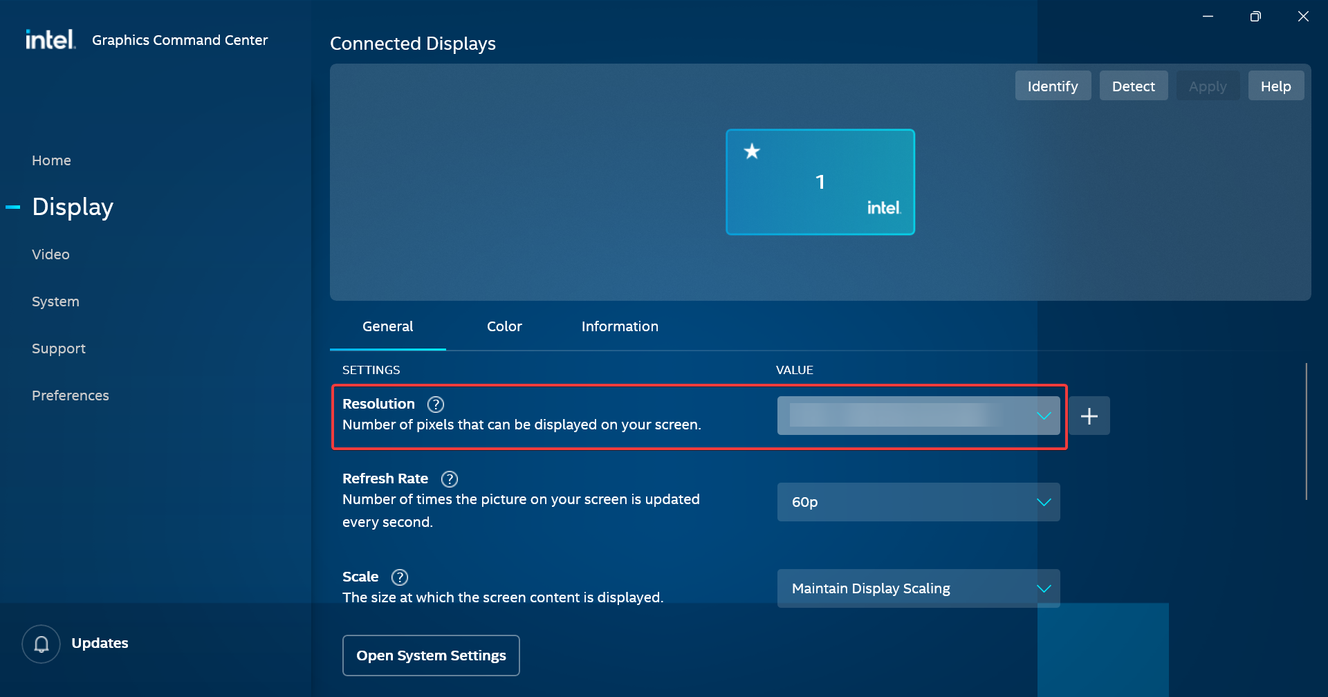 - Now, choose the desired setting from the Resolution dropdown menu.